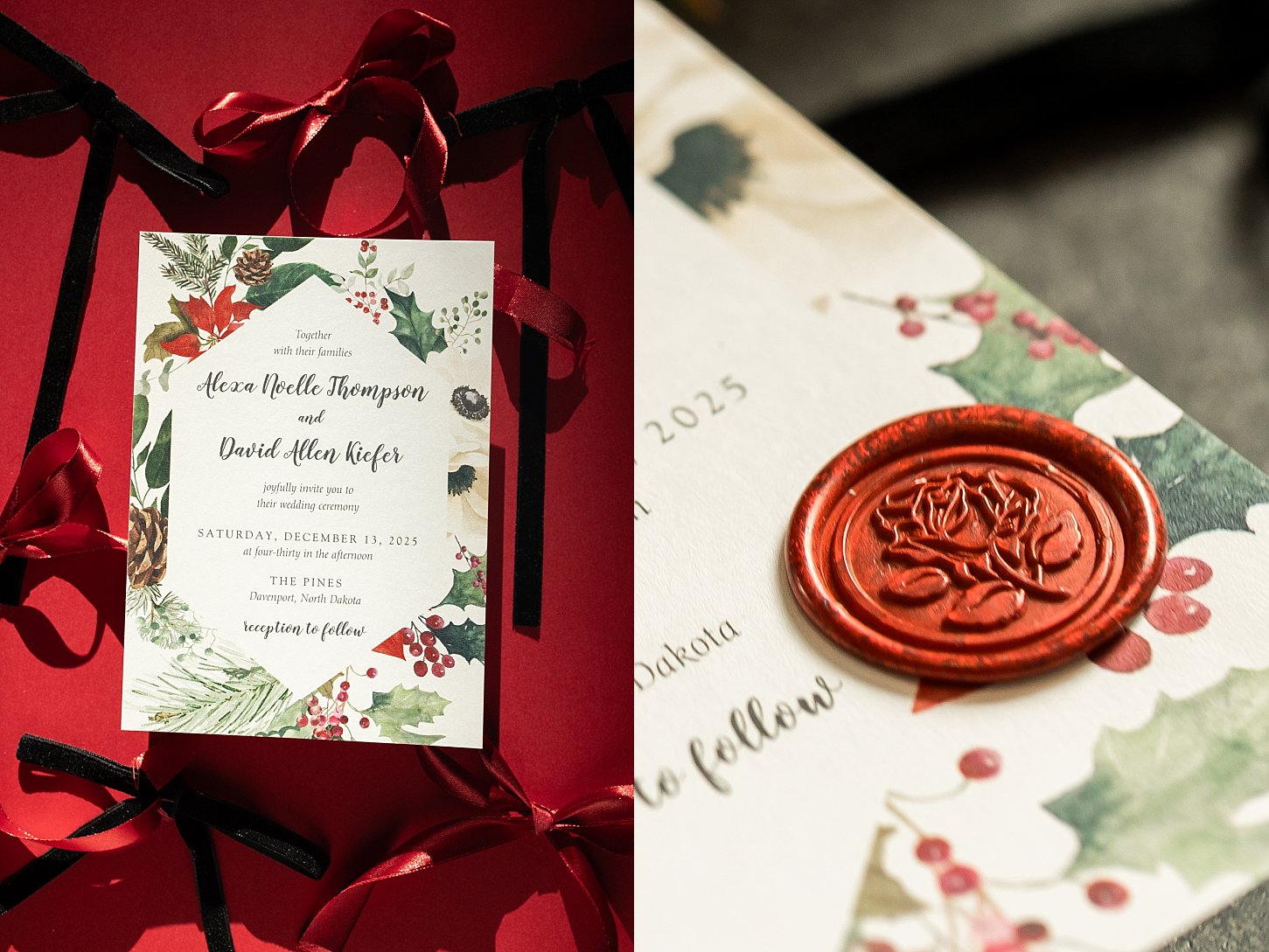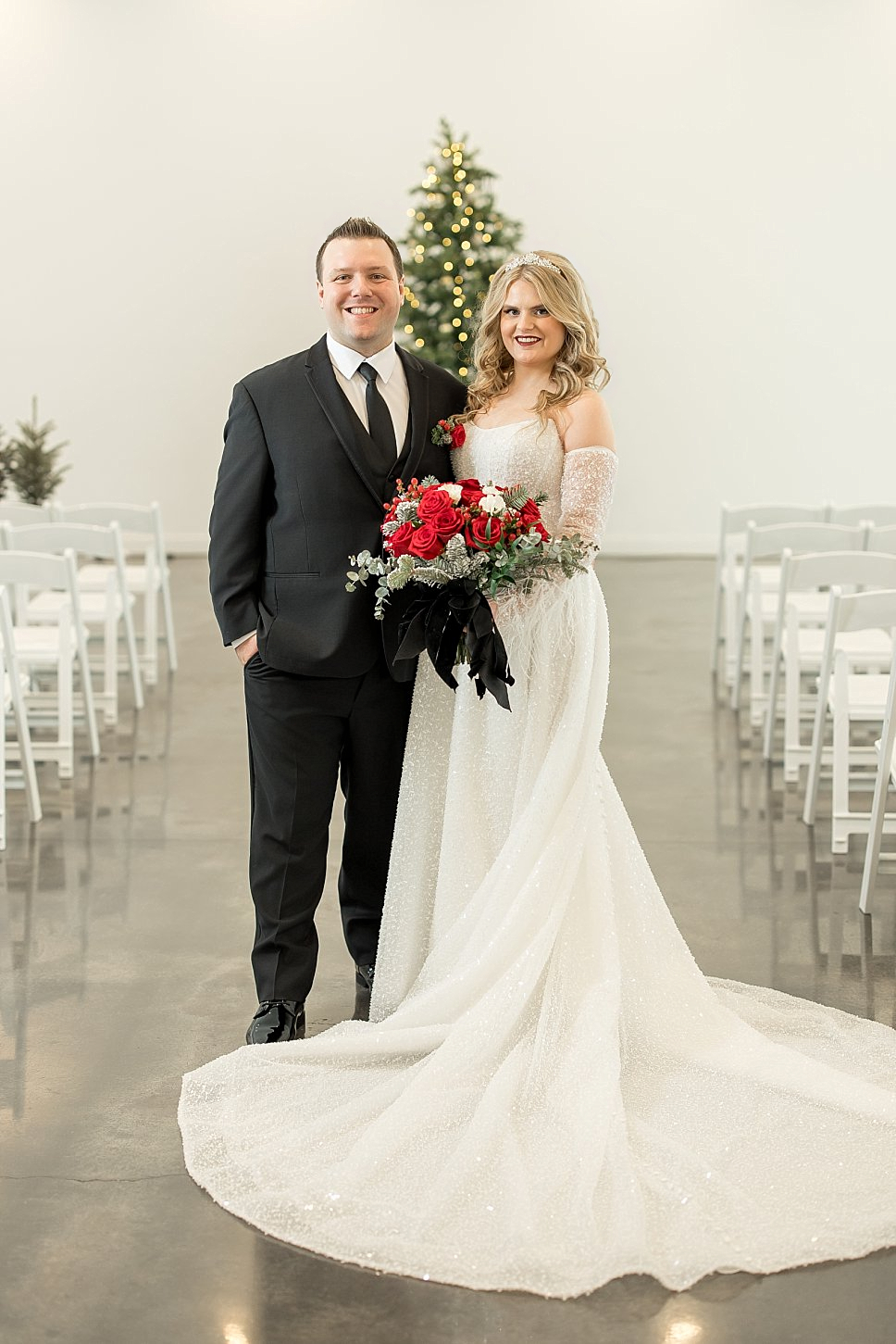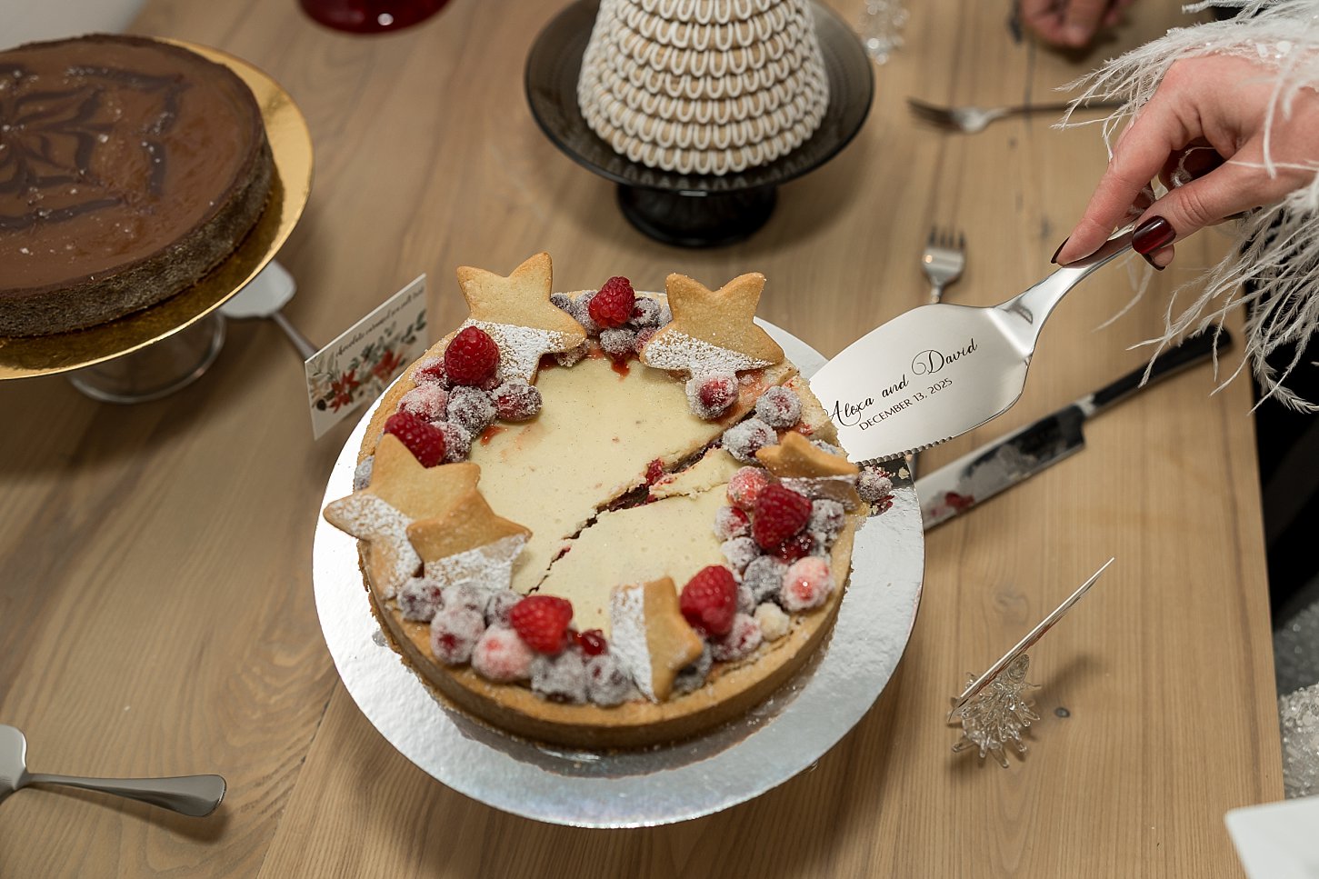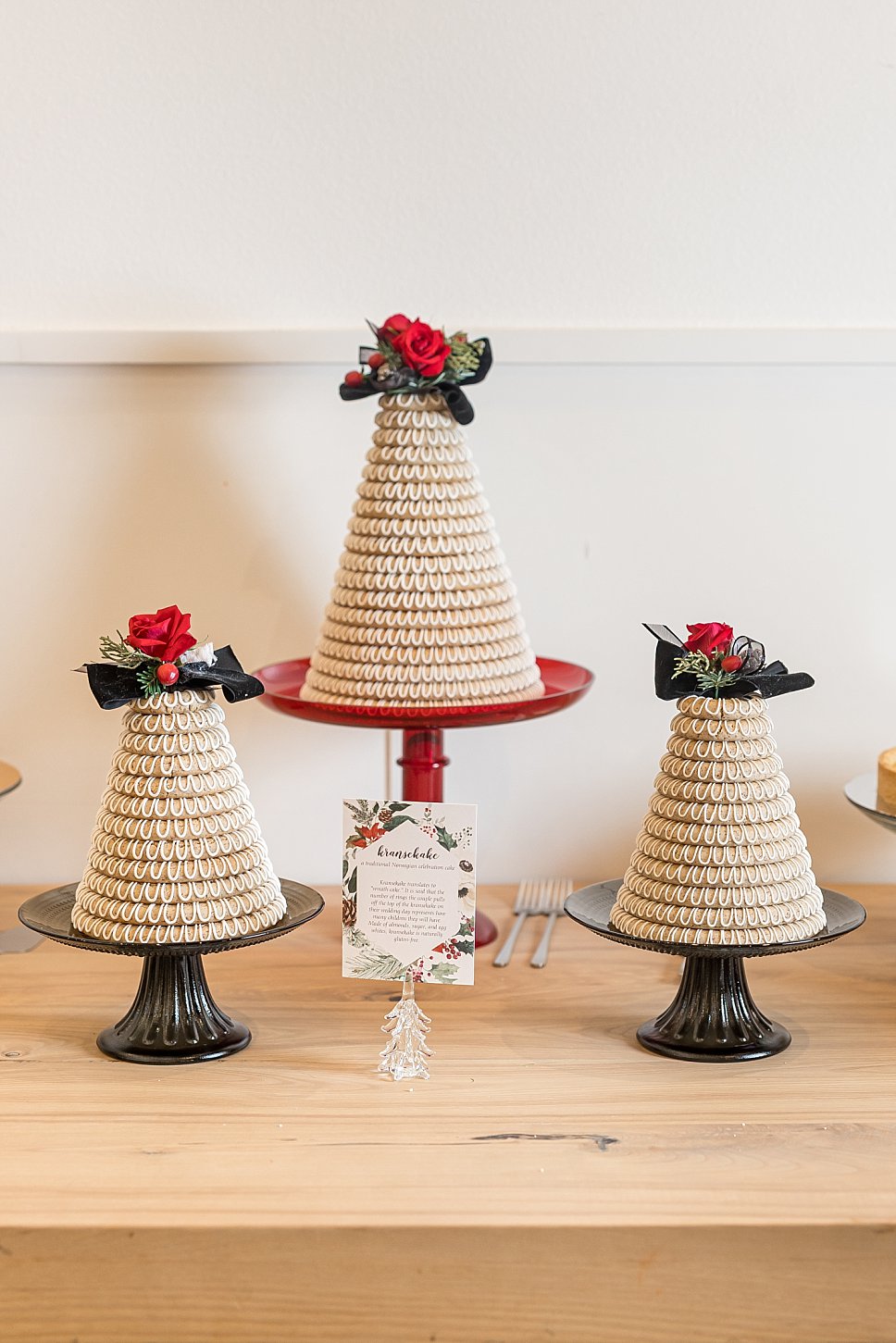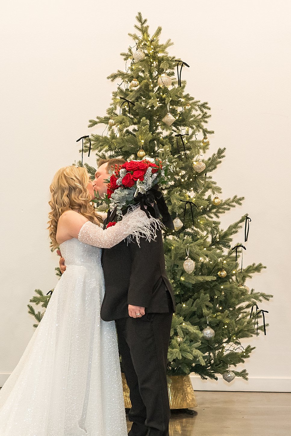 I have a Christmas wedding to share with you today! Alexa & David were married on Saturday at The Pines Black, and every part of the venue was decorated in festive tones of red, gold, emerald, and black velvet. Some of my favorite details were the Norwegian kransekake and a beautifully decorated Christmas tree at the front of their ceremony! After the sun had set, the couple shared a private first dance by the glowing lights of the tree. This was a wedding day full of holiday magic!
