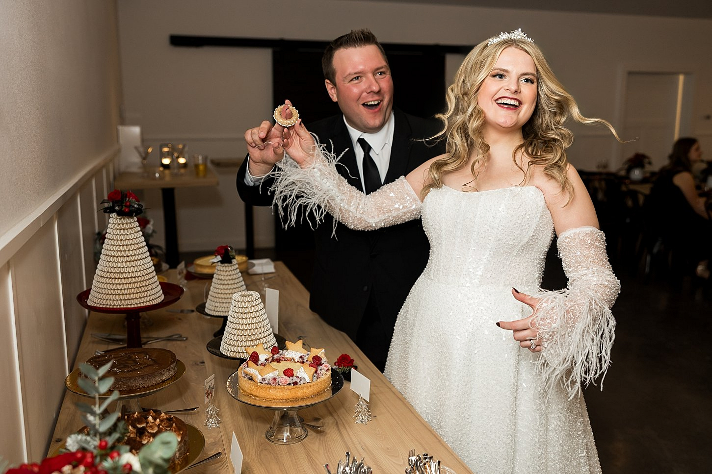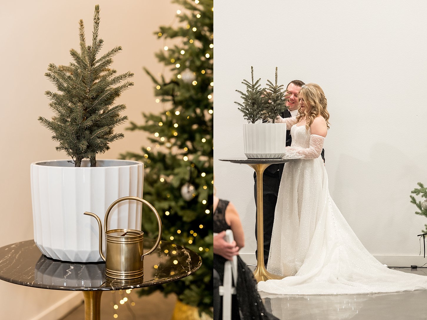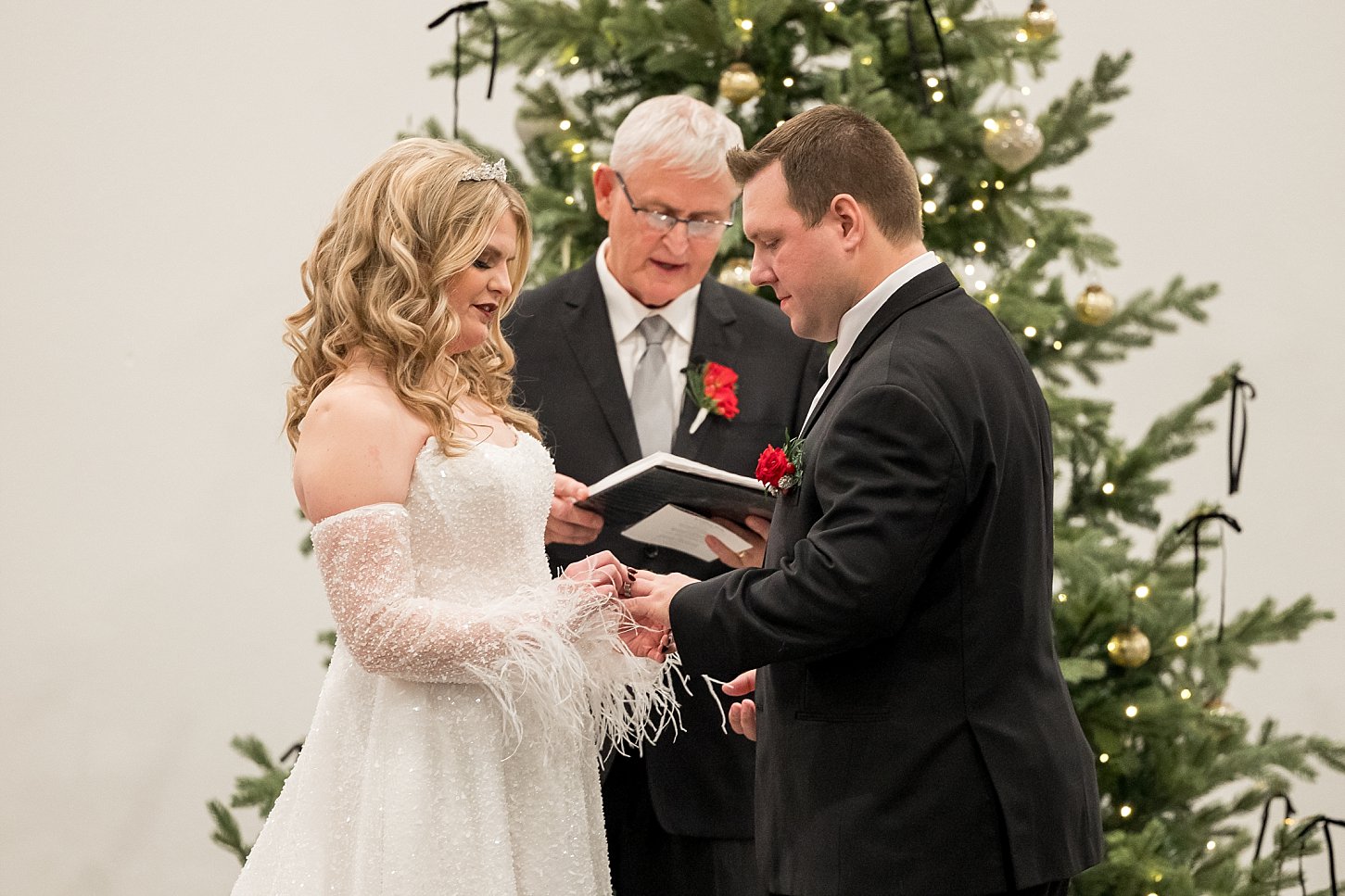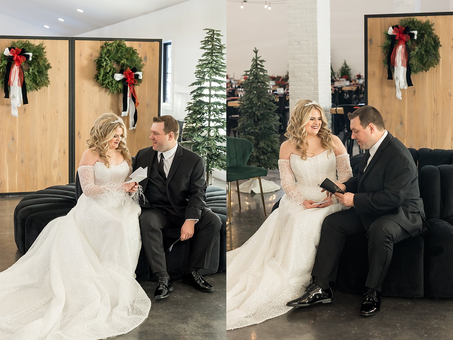 I have a Christmas wedding to share with you today! Alexa & David were married on Saturday at The Pines Black, and every part of the venue was decorated in festive tones of red, gold, emerald, and black velvet. Some of my favorite details were the Norwegian kransekake and a beautifully decorated Christmas tree at the front of their ceremony! After the sun had set, the couple shared a private first dance by the glowing lights of the tree. This was a wedding day full of holiday magic!