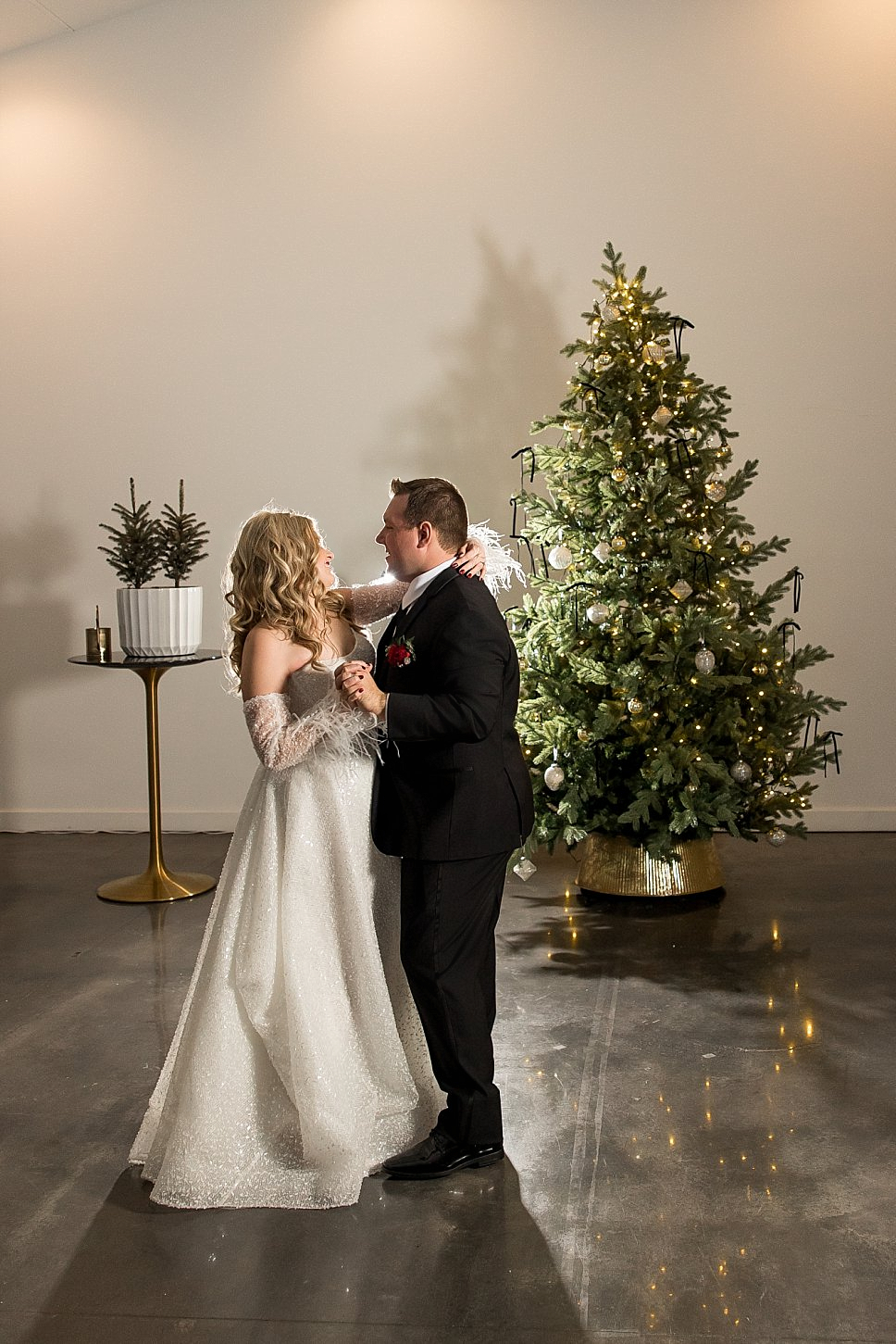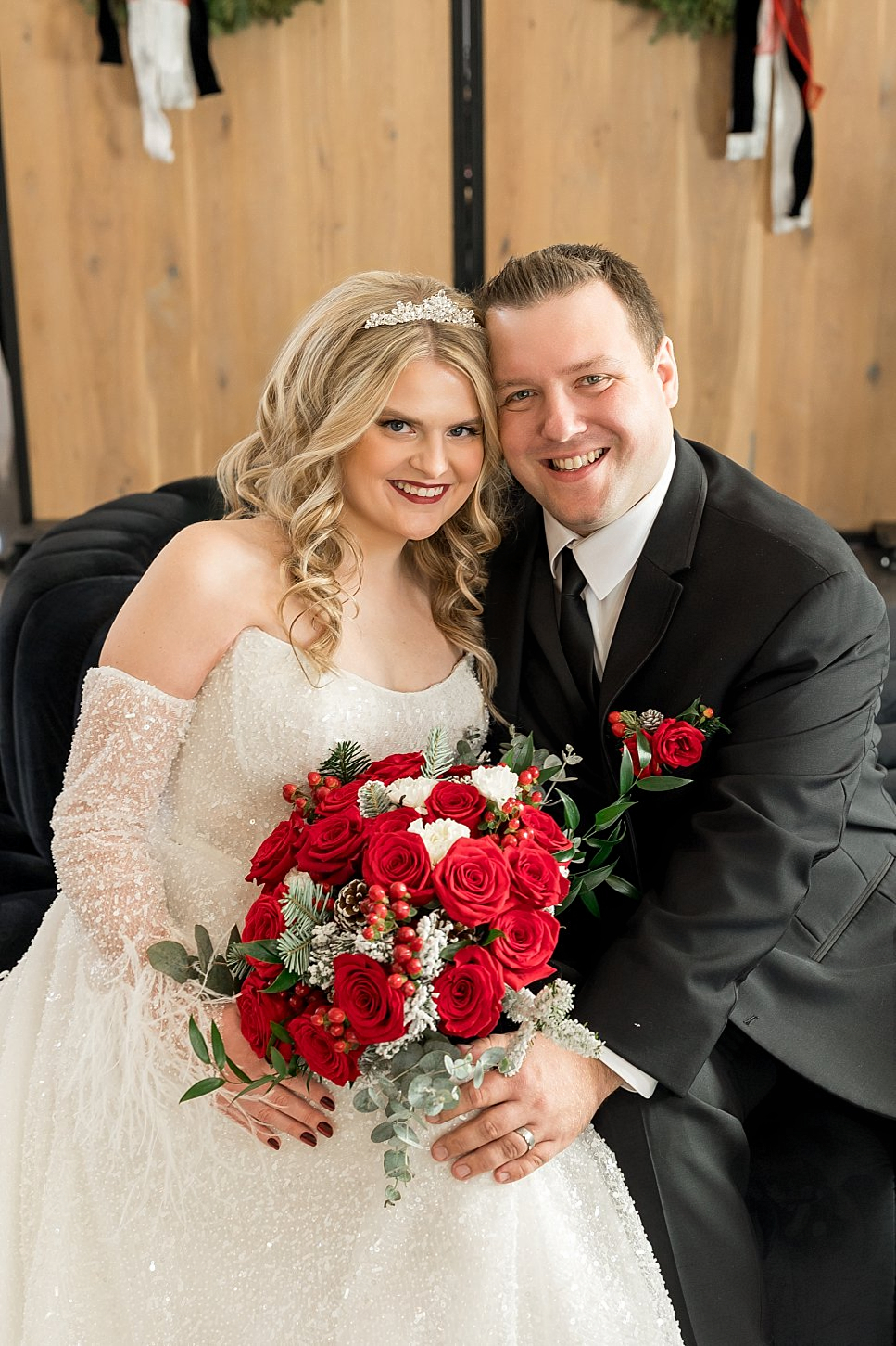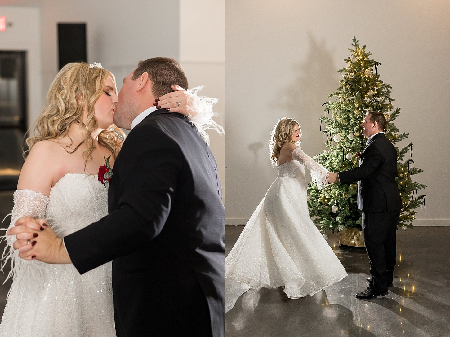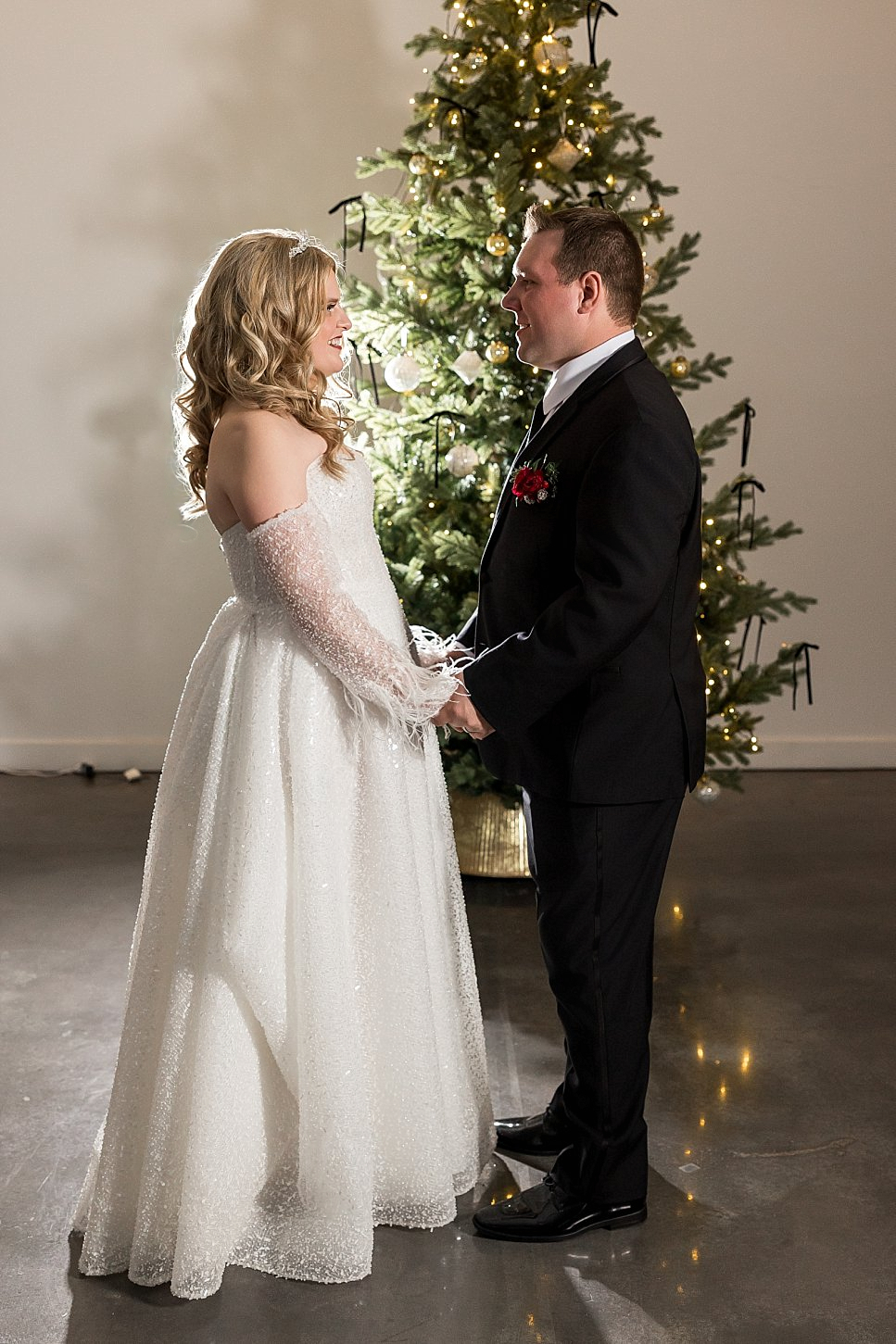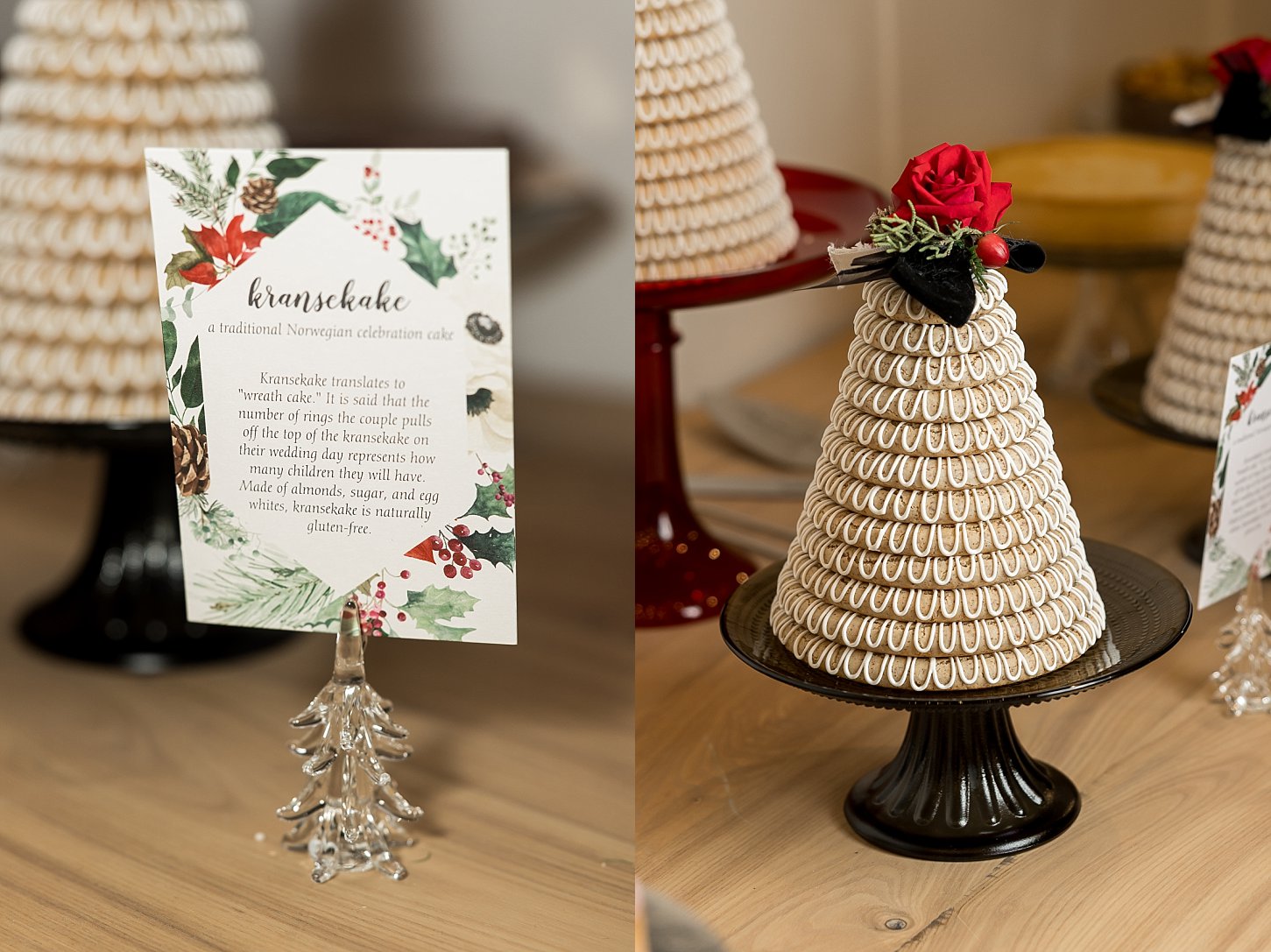 I have a Christmas wedding to share with you today! Alexa & David were married on Saturday at The Pines Black, and every part of the venue was decorated in festive tones of red, gold, emerald, and black velvet. Some of my favorite details were the Norwegian kransekake and a beautifully decorated Christmas tree at the front of their ceremony! After the sun had set, the couple shared a private first dance by the glowing lights of the tree. This was a wedding day full of holiday magic!